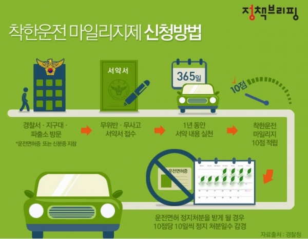 - 적립 비율: 10점의 마일리지로 면허 정지 일수를 10일 감경받을 수 있습니다.